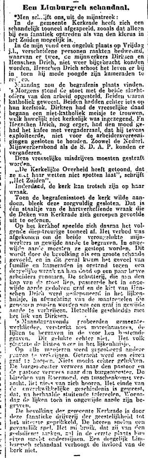 Op vrijdag 1 juni 1917 gebeurt er een tragisch ongeval in de Domaniale mijn. Door het schieten met dynamiet komen gassen vrij waardoor er twee mensen sterven: N.J. Derix en Hendrik Joseph Hensgens. De laatste is een socialist en N.J. Derix is enkele maanden tevoren gehuwd met een niet-katholiek meisje en dus wel voor de wet getrouwd, maar niet voor de kerk.