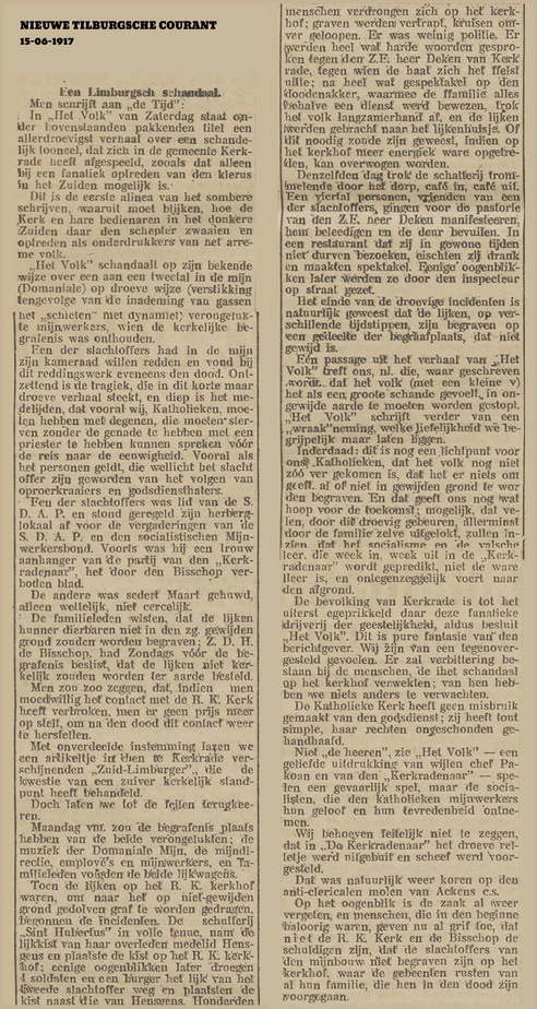 Net door die strijd tussen socialisten en katholieken wordt het gebeuren landelijk nieuws. Op de foto’s het artikel uit Het Volk (socialistisch blad) van 9 juni 1917 en ook het artikel uit de Nieuwe Tilburgsche Courant (katholiek) van 15-06-1917. (Klik op de afbeelding voor een vergrootte weergave)