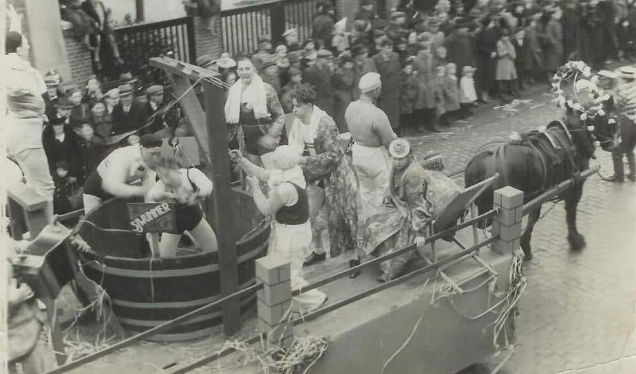 De toneelvereniging loopt op 28 februari 1938 mee in de Kerkraadse Carnavalsoptocht. Het onderwerp dat zij op de afbeelding uitbeelden gaat over de opening van Zwembad Erenstein.