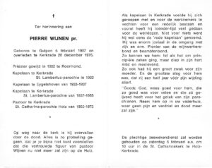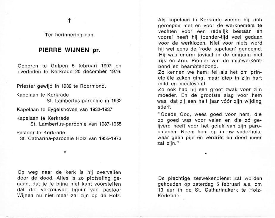Pierre Wijnen is op 5 februari 1907 in Gulpen geboren en hij overlijdt op 20 december 1976 te Kerkrade. Hij wordt begraven op de Holz.